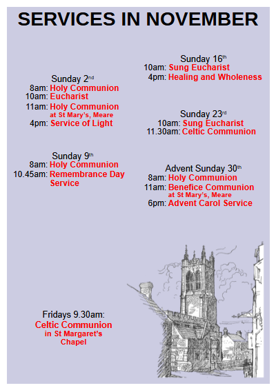This coming Sunday, the Benefice is meeting in St Mary’s, Meare, at 11am to celebrate Advent Sunday.