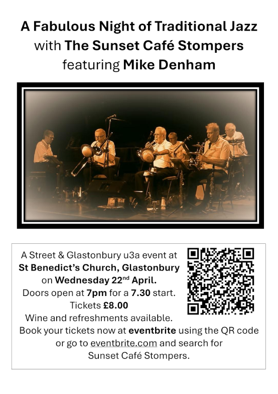 This concert, organised by Street and Glastonbury u3a, brings The Sunset Café Stompers to St Ben’s playing traditional and New Orleans style jazz. This 7 piece band features Mike Denham on piano. Buy your tickets at eventbrite for only £8 each. For more details, click the picture. An evening to get your feet tapping!